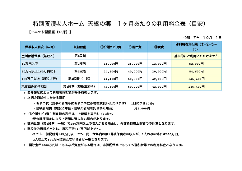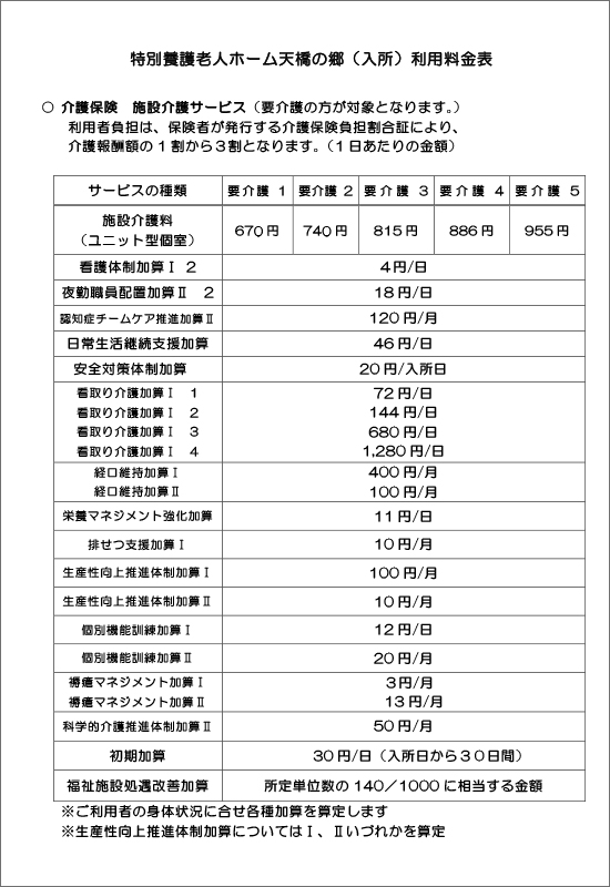 特別養護老人ホーム 天橋の郷(入所 利用料金表)