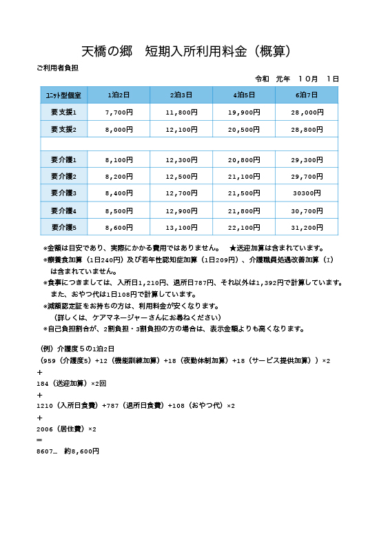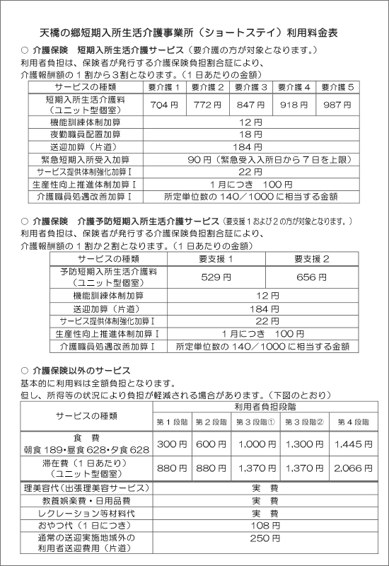 天橋の郷短期入所生活介護事業及び天橋の郷介護予防短期入所生活介護事業(ショートステイ利用料金表)