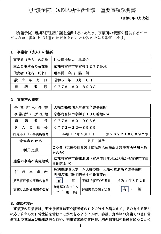 施設・事業 天橋の郷短期入所生活介護事業及び天橋の郷介護予防短期入所生活介護事業