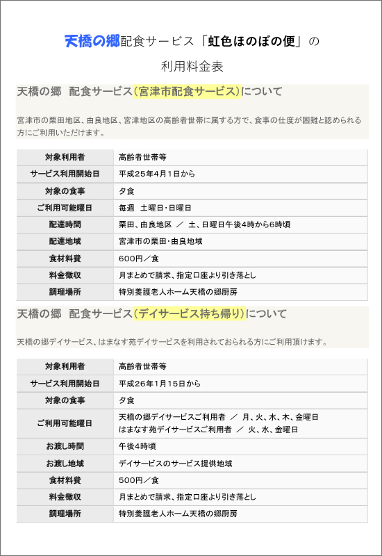 「虹色ほのぼの便」天橋の郷配食サービス事業について